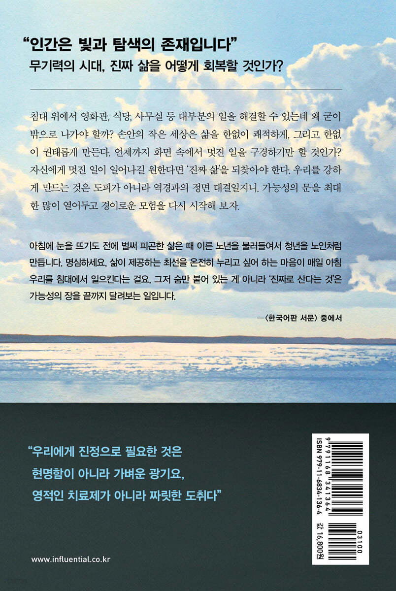 이 책은 삶의 방향성을 잃었거나, 현재의 삶이 억압적이고 답답하게 느껴지는 이들에게 새로운 시각과 용기를 줄 것입니다. 브뤼크네르의 메시지는 단순히 더 나은 삶을 추구하라는 것이 아니라, 삶의 본질을 이해하고 지금 이 순간을 온전히 누리라는 것입니다. *《우리 인생에 바람을 초대하려면》*은 깊은 철학적 성찰과 실천적 조언을 결합하여 독자들의 마음속에 긴 여운을 남깁니다.